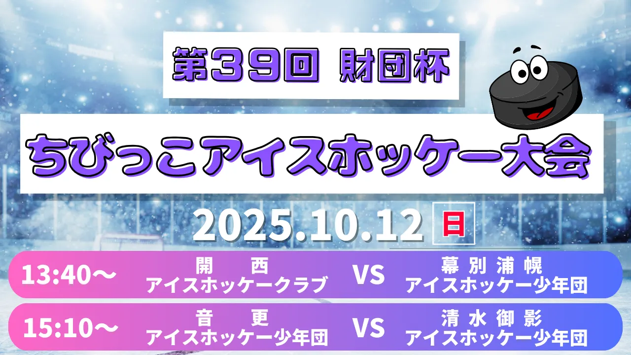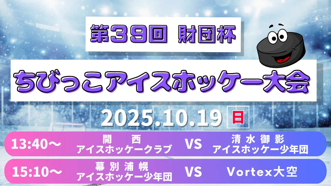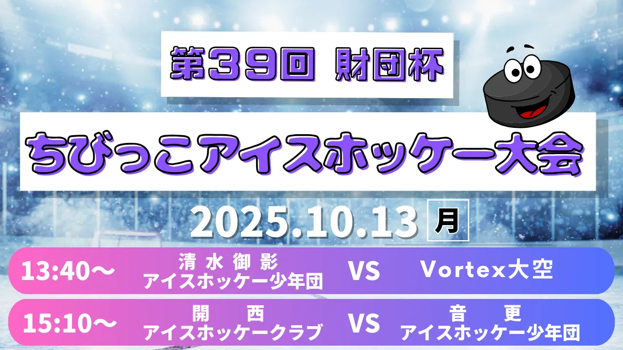 2025年10月13日(月)|第39回 財団杯ちびっこアイスホッケー大会|⑤清水御影 vs Vortex大空 ⑥関西 vs 音更