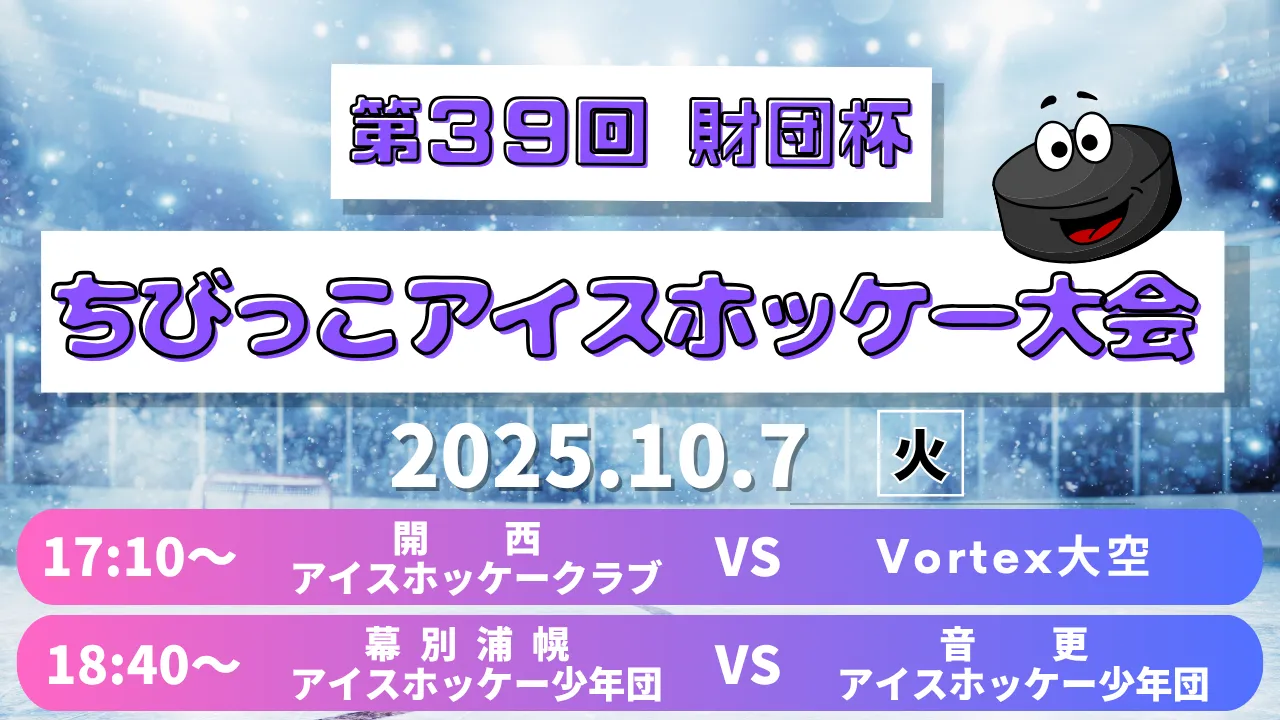 2025年10月7日(火)|第39回 財団杯ちびっこアイスホッケー大会|①関西 vs Vortex大空 ②幕別浦幌 vs 音更