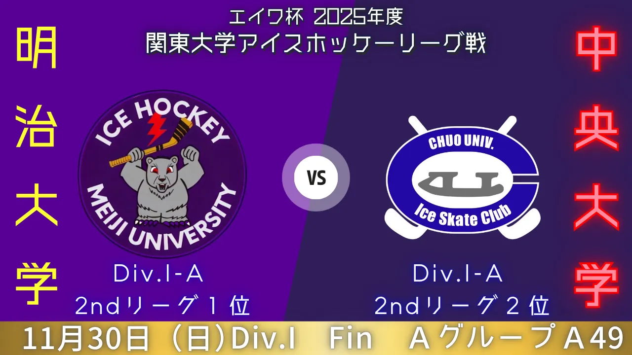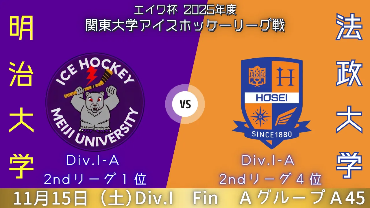 2025年11月15日(土)|エイワ杯 2025年度 関東大学アイスホッケーリーグ戦|A45|明治大学 vs 法政大学