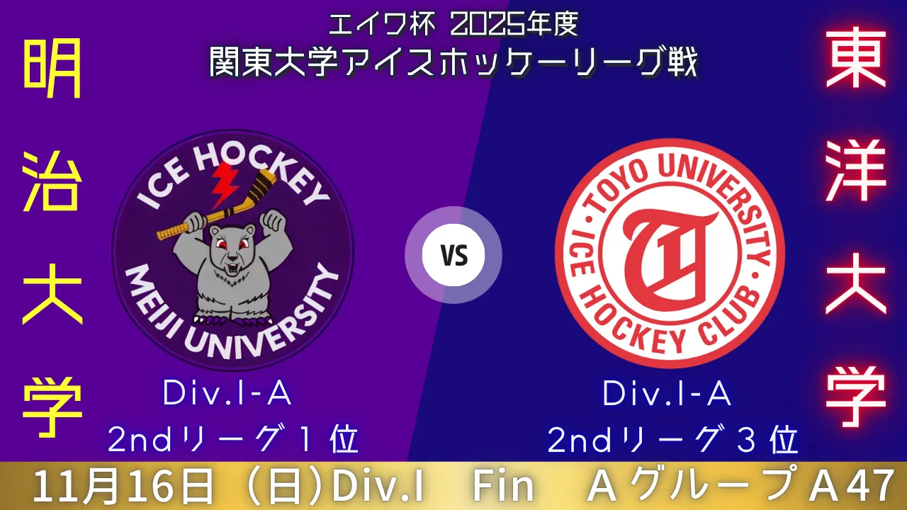 2025年11月16日(日)|エイワ杯 2025年度 関東大学アイスホッケーリーグ戦|A47|明治大学 vs 東洋大学
