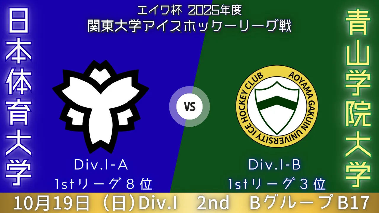 2025年10月19日(日)|エイワ杯 2025年度 関東大学アイスホッケーリーグ戦|B17|日本体育大学 vs 青山学院大学