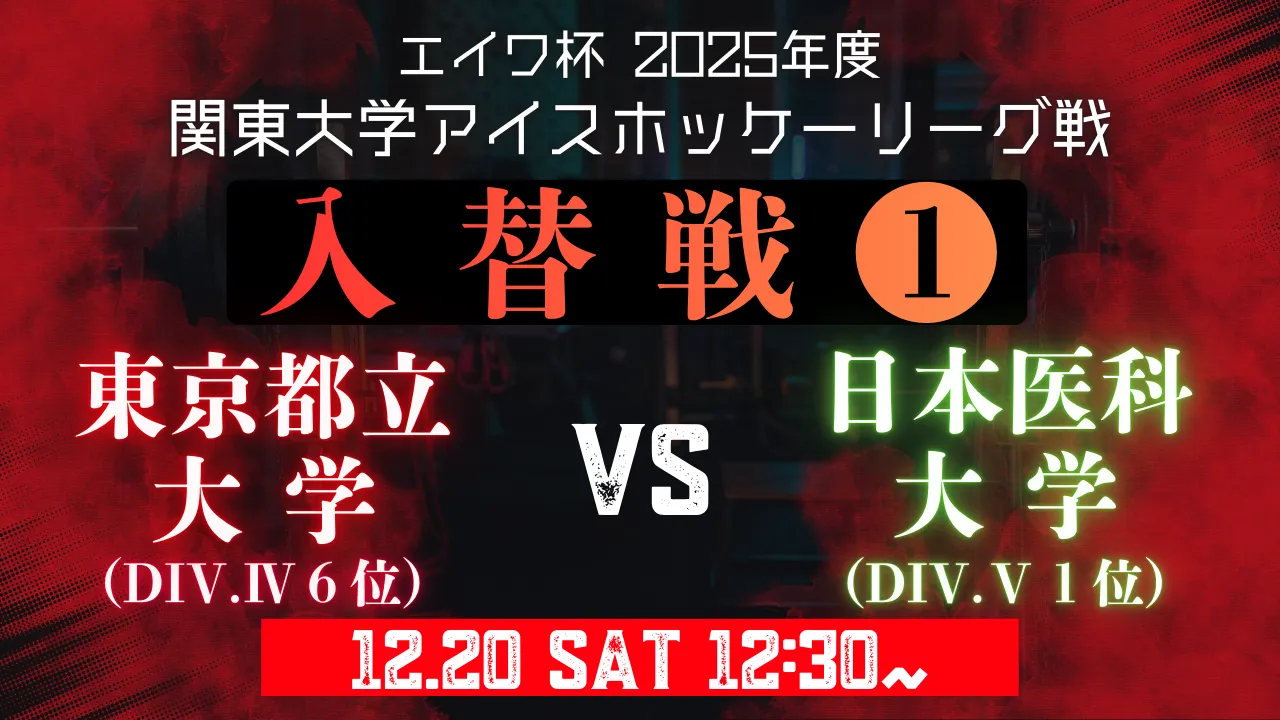 2025年12月20日(土)|エイワ杯 2025年度 関東大学アイスホッケーリーグ戦|東京都立大学 (Div Ⅳ6位) vs 日本医科大学(DivV1位)