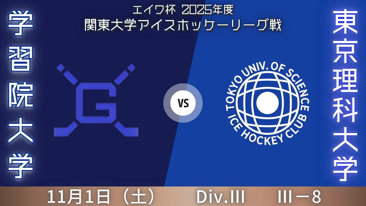 2025年11月1日(土)|エイワ杯 2025年度 関東大学アイスホッケーリーグ戦|Ⅲ-8|学習院大学 vs 東京理科大学
