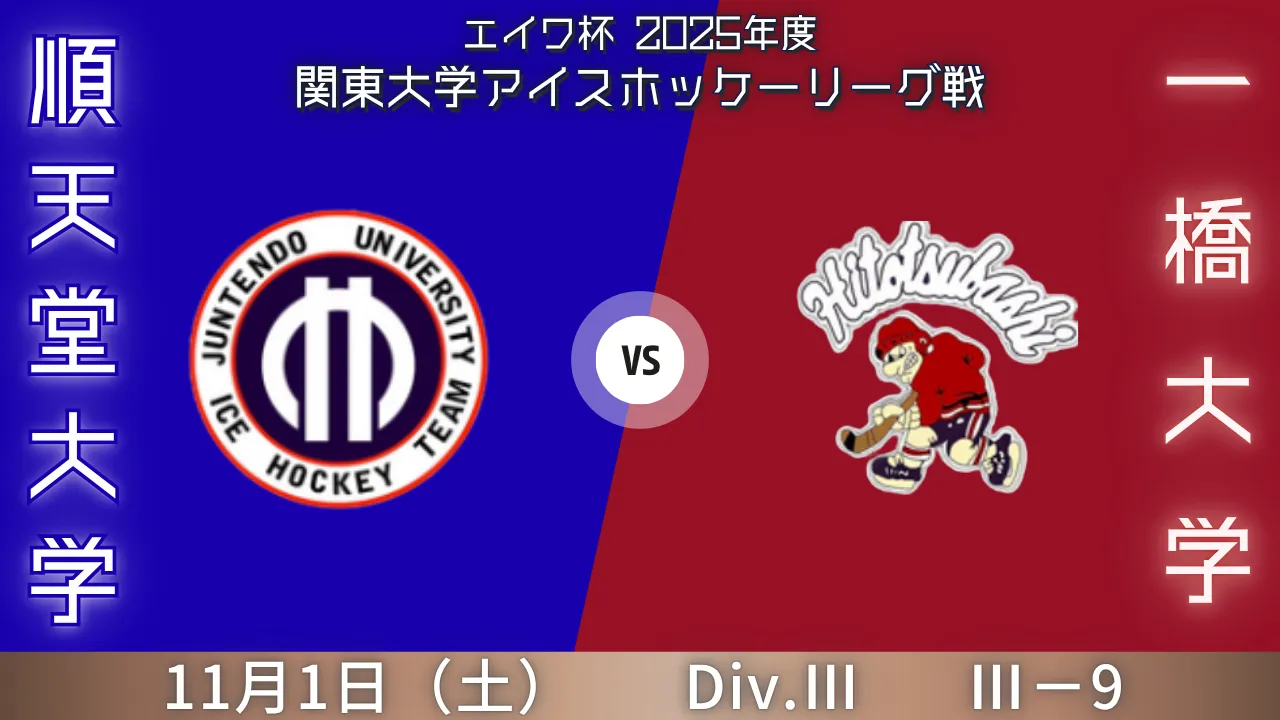 2025年11月1日(土)|エイワ杯 2025年度 関東大学アイスホッケーリーグ戦|Ⅲ-9|順天堂大学 vs 一橋大学