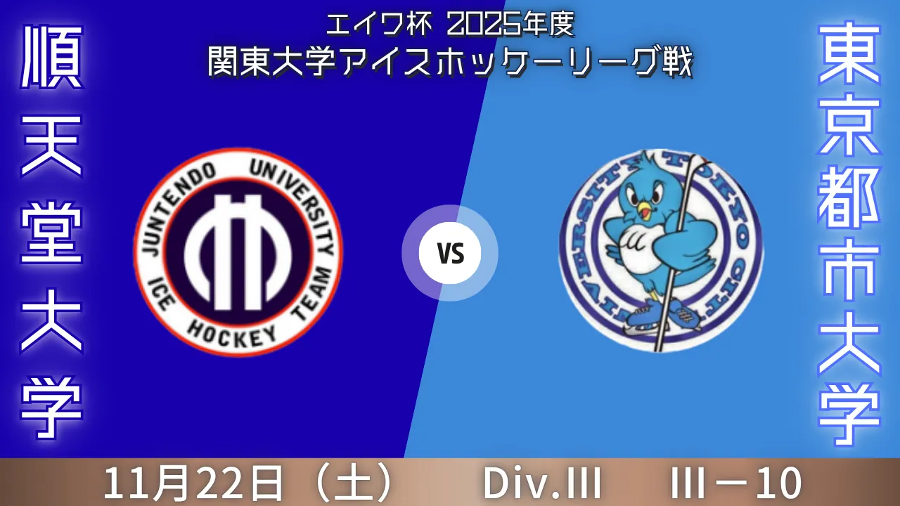 2025年11月22日(土)|エイワ杯 2025年度 関東大学アイスホッケーリーグ戦|Ⅲ-10|順天堂大学 vs 東京都市大学
